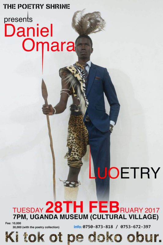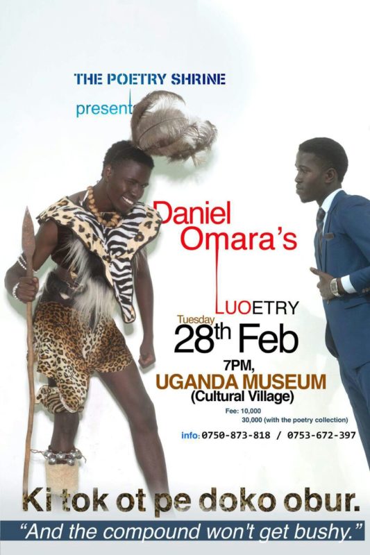 DO: The gap between appreciation of contemporary trends and recognition of Ugandan tribal cultures is really wide. The average teenager now would largely consider preservation of his native people’s ways is the responsibility of his cultural leaders and those near them and not his own. The LUOETRY poster is fortunately much more accessible by this average teenager than these cultural leaders in point. This average teenager too is much more likely to attend the Luoetry than his cultural leaders. With this analogy, the Luoetry poster as a projection of the Luoetry Show is a positive contribution aimed at invoking thoughts on the blessings of cultural heritage.