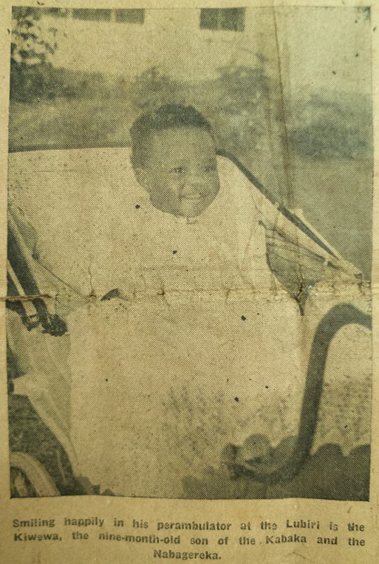 ‘Smiling happily in his perambulator at the Lubiri is the Kiwewa, the nine-month-old son of the Kabaka and the Nabagereka.’