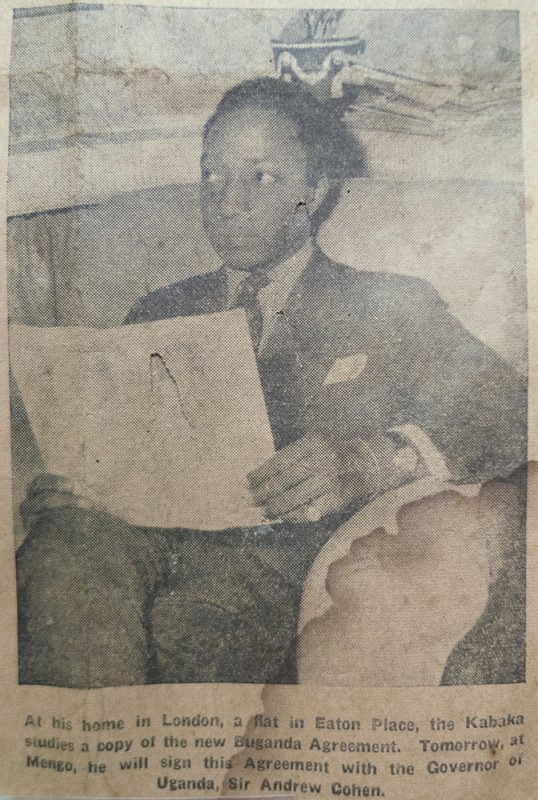 ‘At his home in London, a flat in Eaton Place, the Kabaka studies a copy of the new Buganda Agreement. at Mengo, he will sign this Agreement with the Governor of Uganda, Sir Andrew Cohen.’