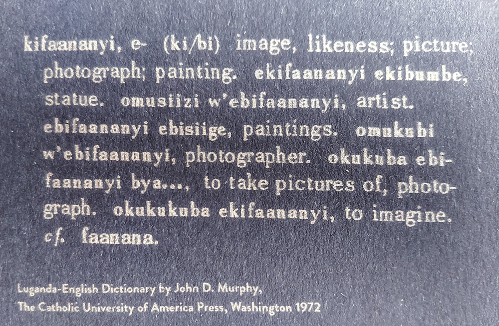 Kifananyi [1] can be translated from Luganda to mean – image, likeness, picture, photograph, or painting. There is a dictionary lemma reproduced at the end of the book that gives different uses of the word and perhaps contributes to a better understanding of some of the sections of this book.