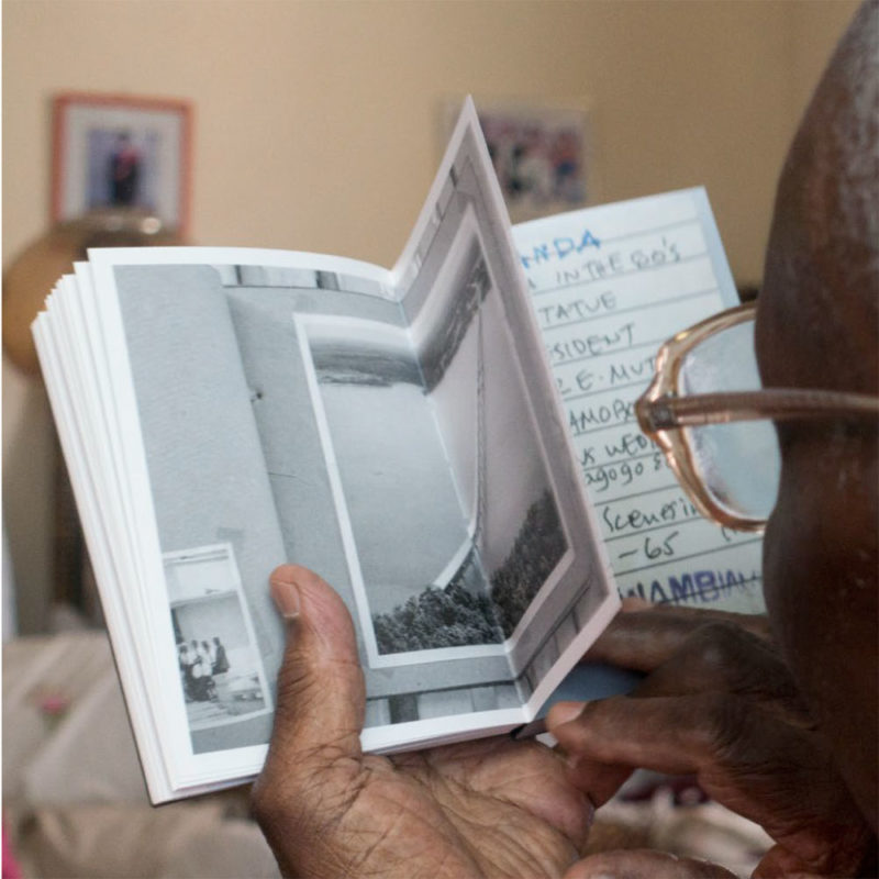 Photograph below, Engineer M.W. Wambwa in his home in 2016, receiving Ebifananyi 5, a publication reflecting on developments in urban environments in Uganda based on his photographs and writing.