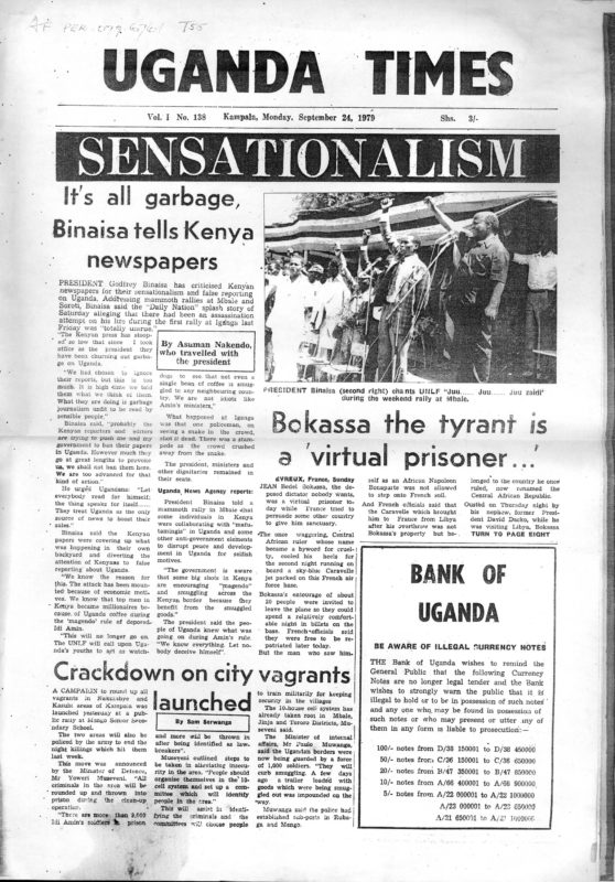 President Godfrey Binaisa has criticised Kenyan newspapers for their sensationalism and false reporting on Uganda. Addressing mammoth rallies at Mbale and Soroti, Binaisa said the “Daily Nation” splash story of Saturday alleging that there had been an assassination attempt on his life during the first rally at Iganga last Friday was “totally untrue.”